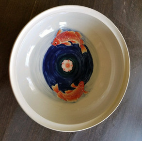 I was honored to be invited to collaborate with a very talented potter Alex Macias for the auction piece for the event. Alex showed me ideas she had, and from there I thought of doing something Japanese inspired and different. I showed her some pictures of a Japanese clay pot called “donabe” and we decided to create a donabe-inspired lidded bowl. I looked through Japanese kimono fabric (yuzen) patterns to get some inspirations and decided on koi fish. Here are the photos of before and after firing.